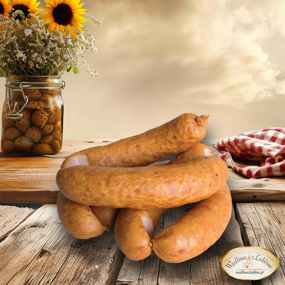 Składniki: mięso wieprzowe(80%), woda, skrobia, sól, przyprawy, ekstrakty przypraw i aromaty, białka mleka (z laktozą), substancje zagęszczające guma tara, guma ksantanowa, wzmacniacz smaku: glutaminian monosodowy, hydrolizat białka sojowego, przeciwutleniacze: kwas L-askorbinowy, izoaskorbinian sodu, stabilizator: trifosforany, regulator kwasowości: cytrynian sodu, octan sodu, glukoza, barwnik koszenila, substancja konserwująca: zotan sodu, osłonka jadalna wieprzowa.