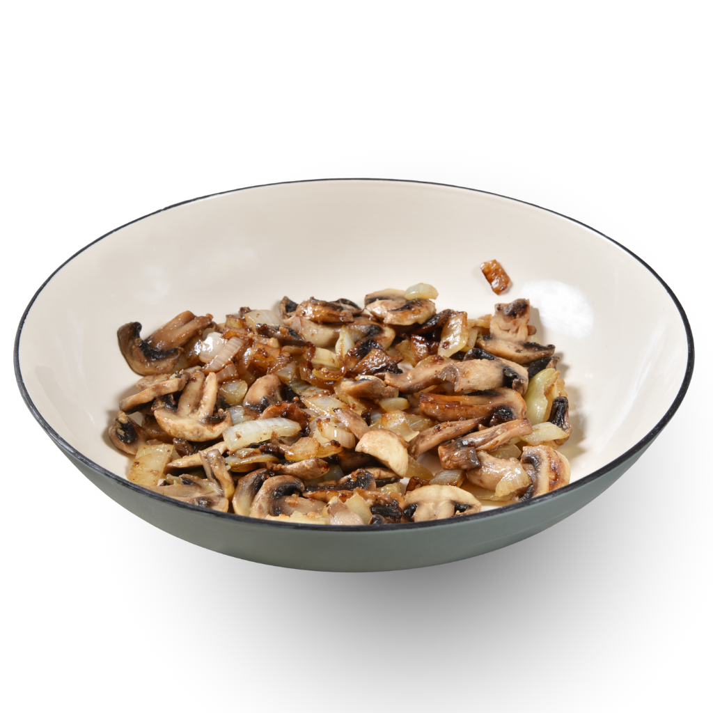 Aromatyczne pieczarki podsmażone na złoty kolor, podane z chrupiącą, słodką cebulką – idealne jako dodatek lub samodzielna przekąska.